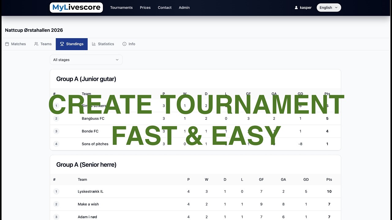 MyLivescore helps clubs and organizers build tournaments fast, manage teams, and share live results with players and fans in one clean workflow.